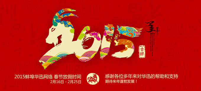 蚌埠華迅網(wǎng)絡科技有限公司2015新年放假時間為2015年2月16日至2月25日,假日期間如有需求請聯(lián)系:0552-3711772 15255232273