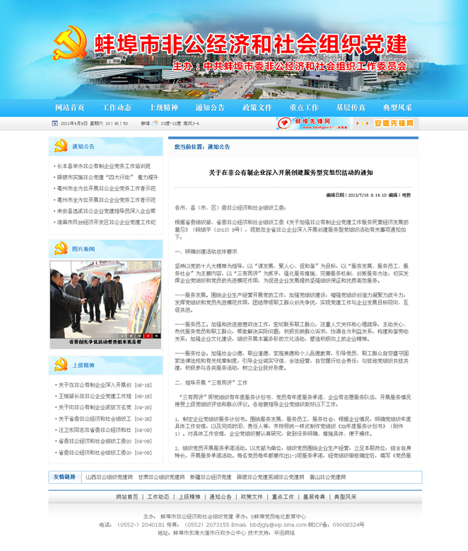 網(wǎng)頁由中共蚌埠市委非公經(jīng)濟(jì)和社會組織工作委員會,蚌埠先鋒網(wǎng)電教中心承辦,作為蚌埠先鋒網(wǎng)子欄目,主要用于蚌埠非公經(jīng)濟(jì)和社會組織黨建工作有關(guān)信息發(fā)布和經(jīng)驗(yàn)交流。